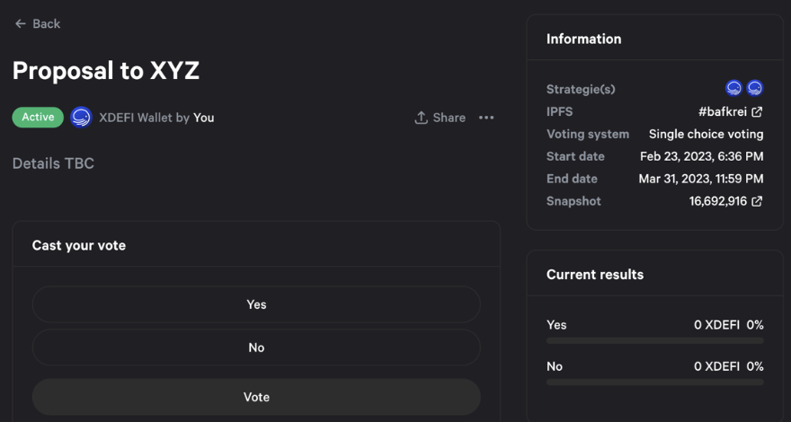 8. Complete – congratulations, you have successfully submitted an XDEFI Community Proposal! Your screen will show your Proposal’s details.