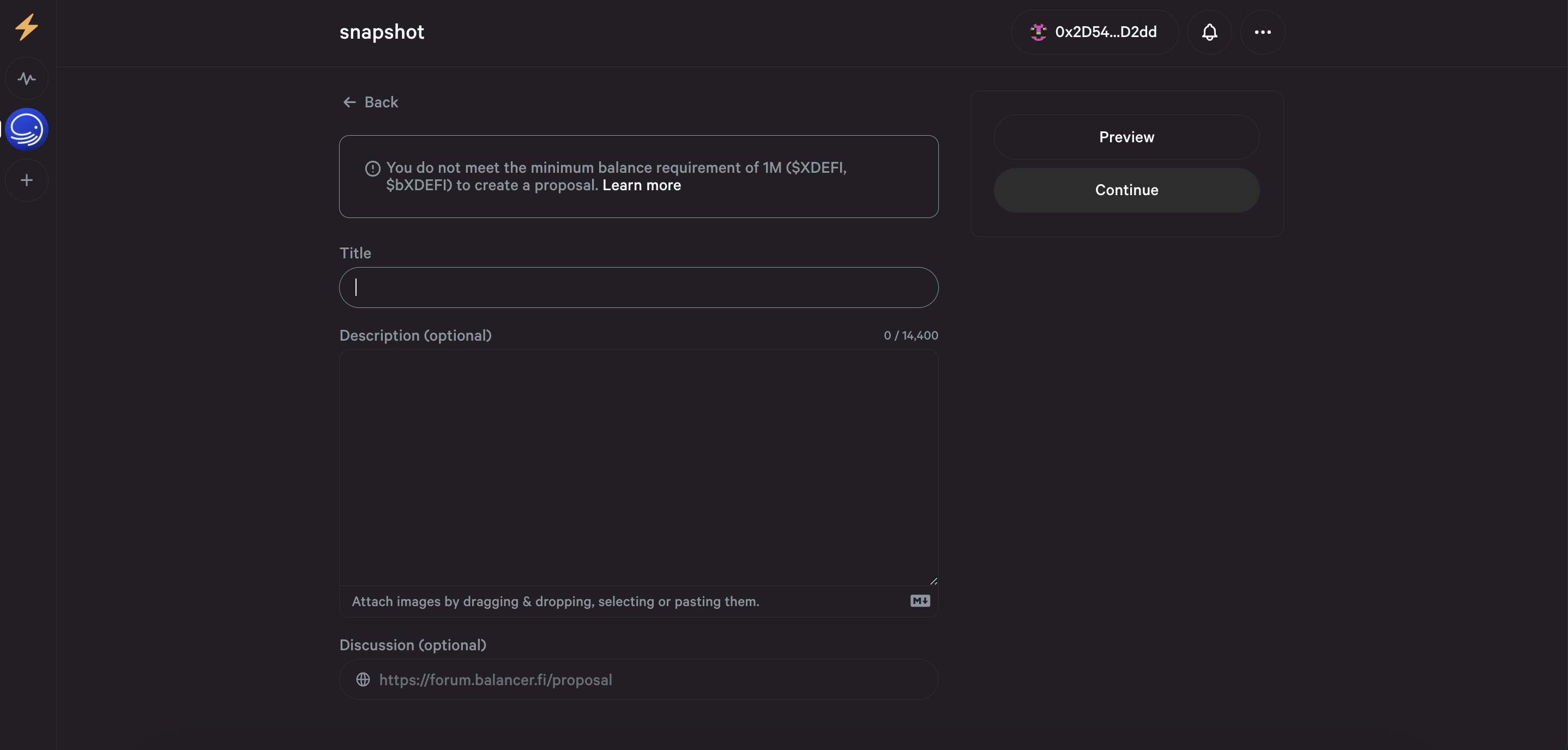 5. Create New Proposal – once your wallet is connected, please click on “New proposal” and then proceed to complete the required details about the Proposal. You can “Preview” your proposal and if you are happy with your “Proposal” proceed to click on “Continue.”