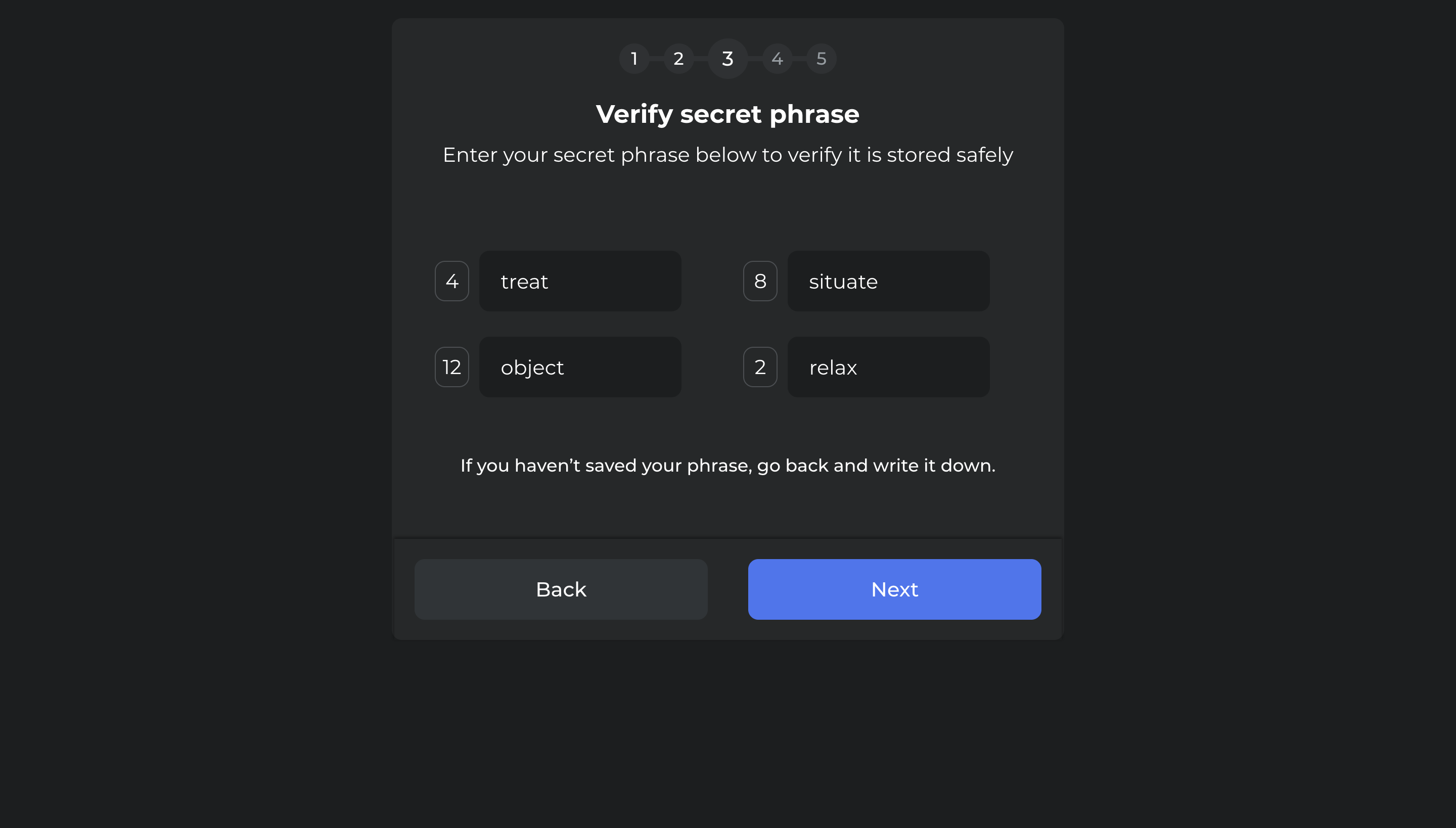 10. Enter the 4 words of your secret phrase that are requested