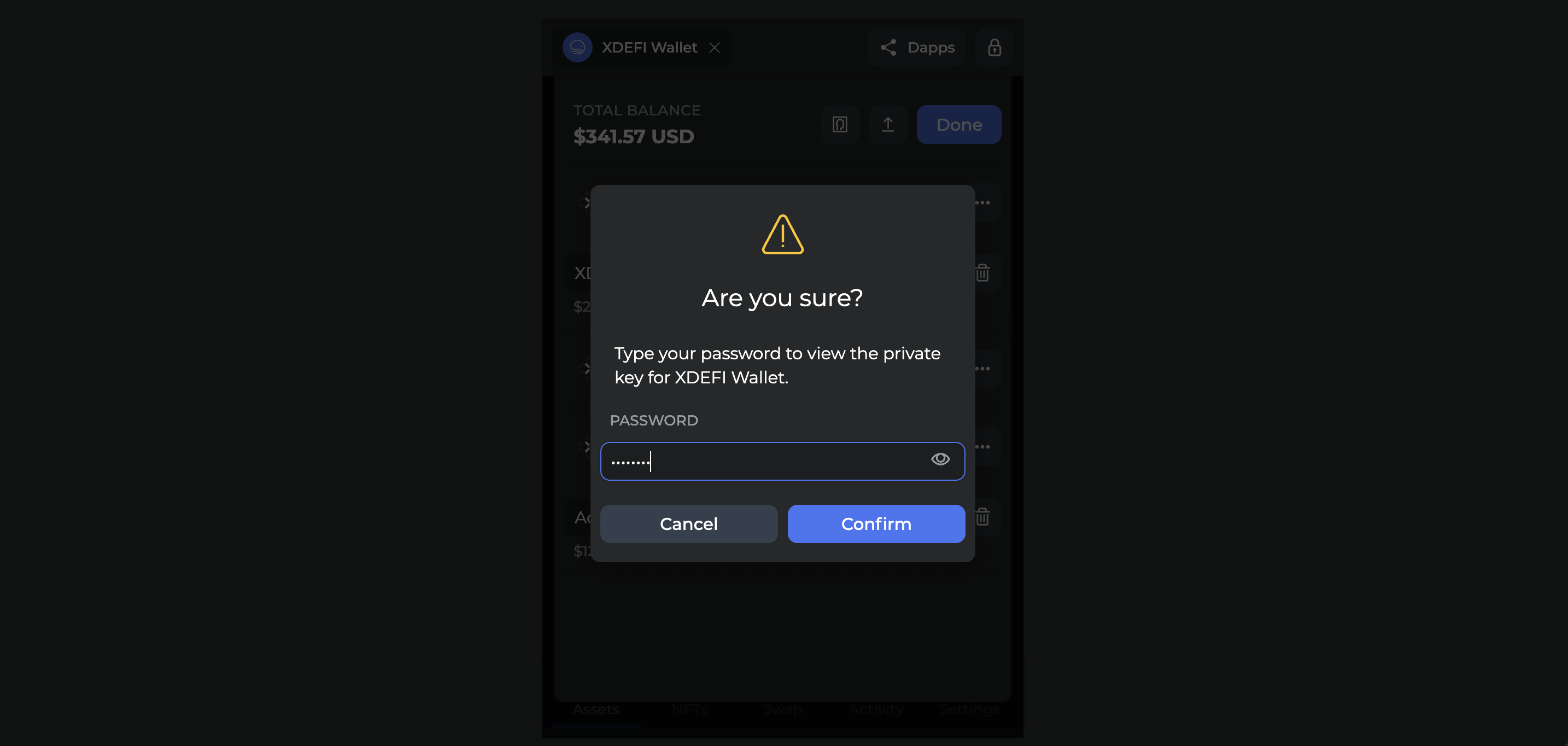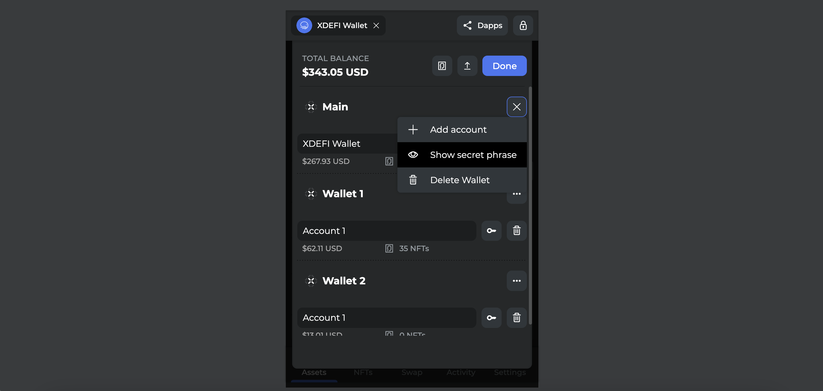 4. Click on the 👁️ icon (if you only have one wallet) or on the ‘…’ associated with the wallet of your choice and select the ‘Show secret phrase’ option
