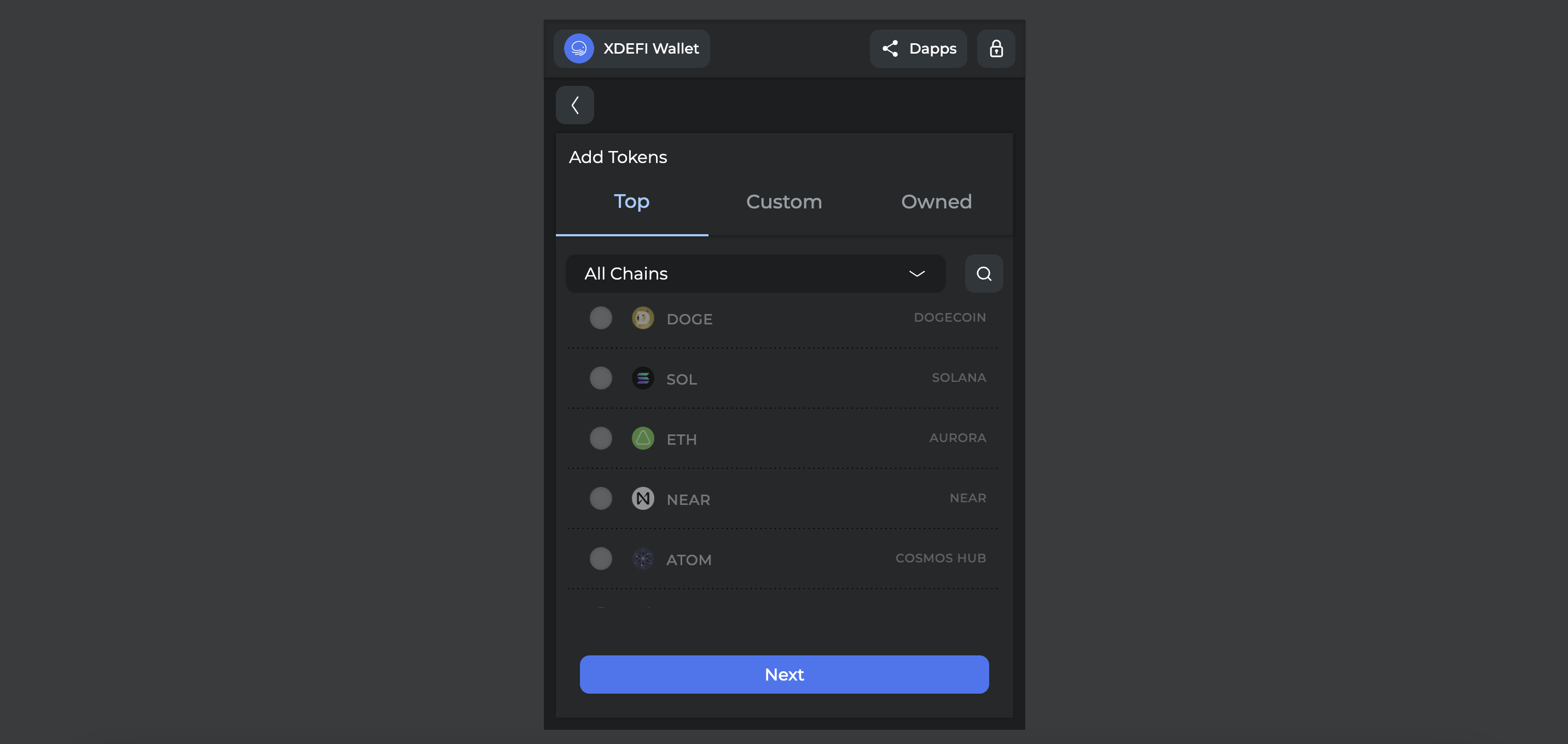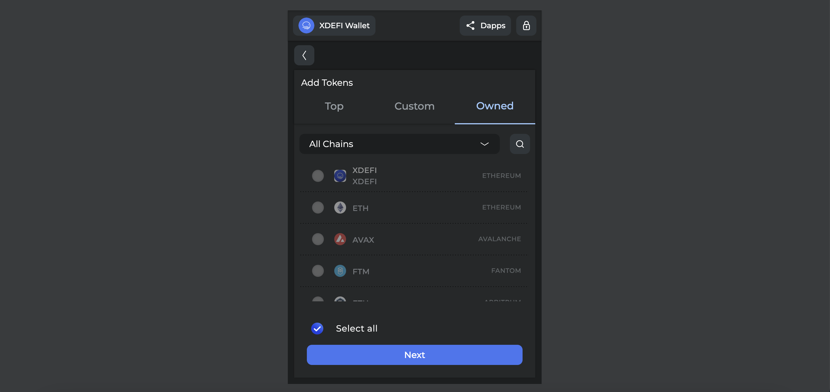 Native coins are directly visible from the XDEFI Wallet home screen; however, you will have to add other tokens manually. Please note: NFTs will appear automatically in the NFT interface: