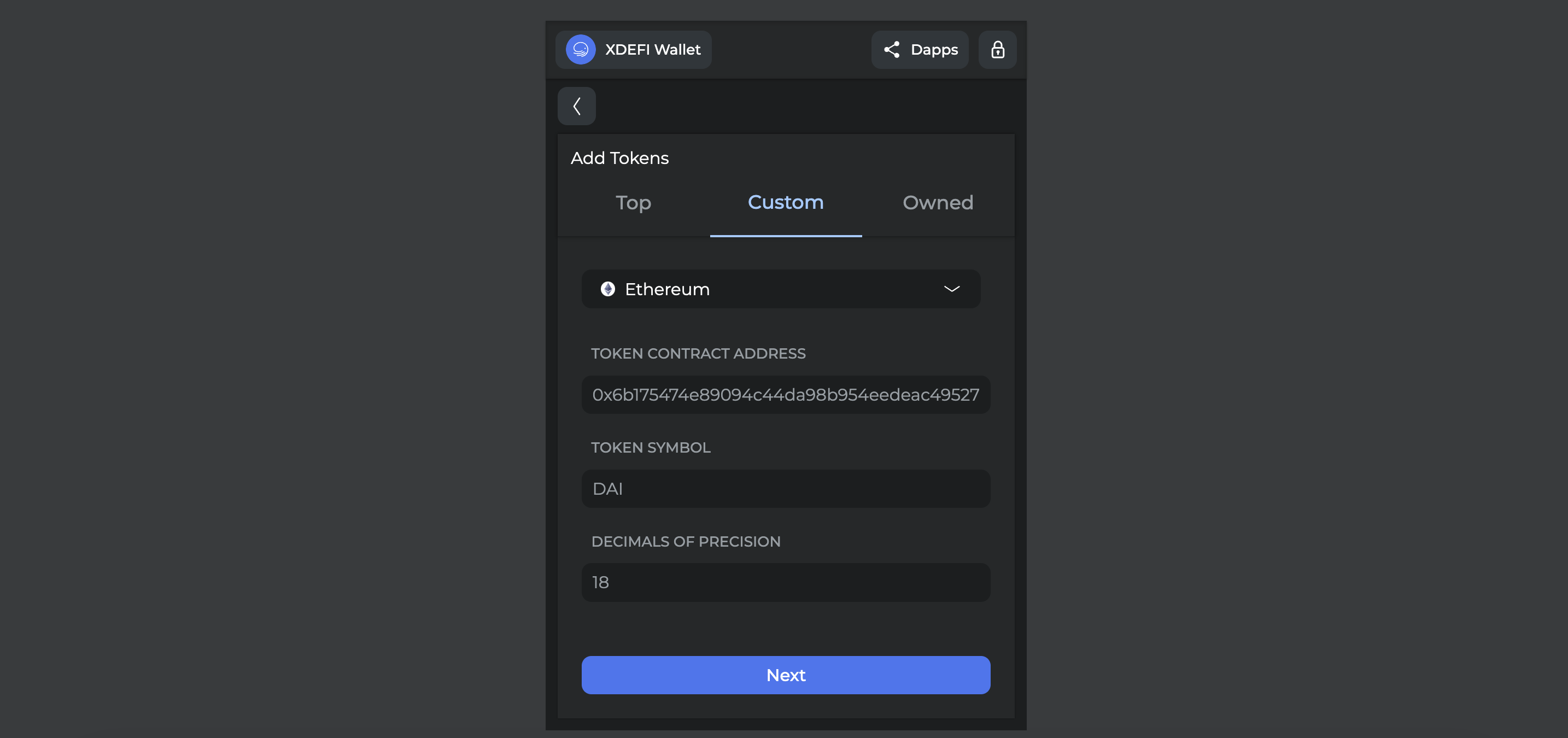 Custom: The custom tab allows you to select a specific chain (when it is possible) and enter the token smart contract address, symbol & decimals of precision