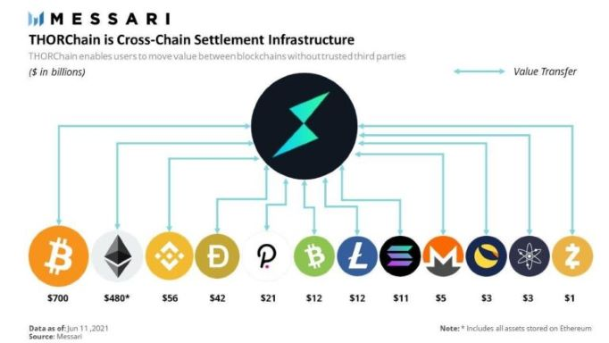 The main differentiator for THORChain is that its liquidity pools can hold native crypto assets from different blockchains (such as ETH and BTC) and can therefore take those assets from one blockchain and send them out to another.