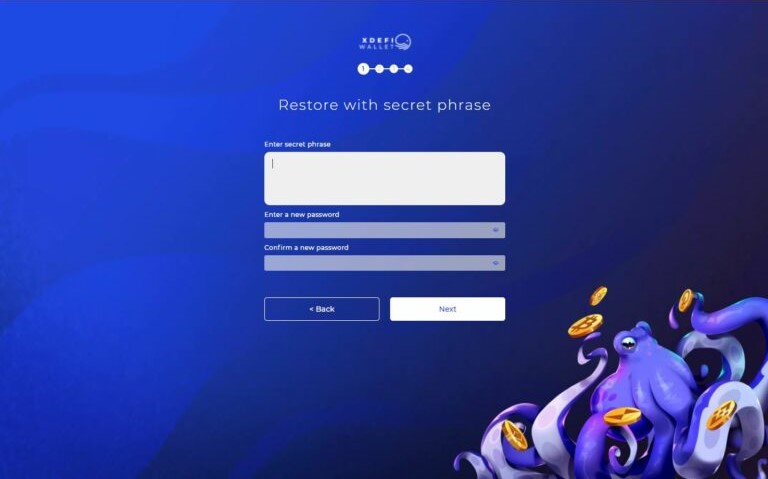 6. Gib hier deine Secret-Phrase ein (Du kannst sie aus der Zwischenablage einfügen) und wähle dein XDEFI Wallet Passwort
