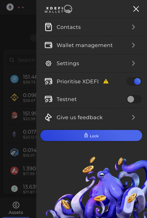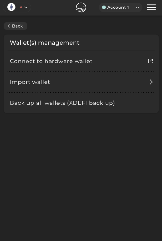 - Depuis l’écran d’accueil de XDEFI Wallet, cliquez sur les trois lignes horizontales en haut à droite